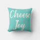 Trendig dekorativ kudde har ett skript i modern avslappnad "Välj glädjen" i vitt på akvatisk bakgrund.