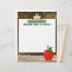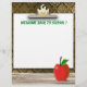 Stationär brevhuvud i anpassningsbar på ett guld-klipp som hänger från söt damm tapet som säger "Välkommen Back to school" i grönt fet 3d-stiltext. Eller lämna bara ut texten helt och hållet genom att ta bort den. Ett rödäpple med grönt löv illustration på ett skrivbord av trä finns i grund hörnet. Det finns massor av kopieringsutrymme till skrivan senare. Underbar personlig presentidé för lärare, läkare, sjuksköterskor, professioneller för hälsovård m.m. "Ett äpple om dagen, behållor bort doktor!"