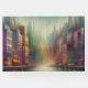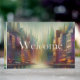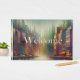 En fredlig förortsscen med vattenvägar och stadens färgstarka skylt bortom