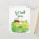 Skicka glada hälsningar med detta charmiga akvarell golf-tema “Snart frisk igen” kort! Med en frodig grön golfbana med en golfboll på en tee eller putting green, frammanar denna design avkoppling och optimism. Den handskrivna texten “Snart frisk igen” visas framträdande, vilket gör det perfekt för golfare, golfentusiaster eller någon som älskar spelet. Perfekt för att skicka genomtänkta och upplyftande hälsningar till vänner eller familj.