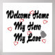 Välkomna hem dina viktiga andra från en distribution med den här designen som lyder: Välkommen hem Min Hero Min Kärlek! Den här designen är underbar för hemkommande dag och finns tillgänglig på t-shirts, hookar, knappar med mera. Den skulle kunna användas för att göra en påstående på hemdagen eller även för andra artiklar, t.ex. mugg som en homeminerande gåva.