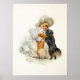 Välkomsthemmet. En liten flicka, som alla är klädda i sitt fineri, med sin fjäderhatt och päls jackar, hälsas av hennes två hundar. Hon nickar ner och kramar dem, eftersom de slickar henne ansikte med glädje. Vintage illustrerad av Harriett Bennett. HTM BILDER