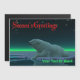 En fridfull stund i den långa arktiska natten. En isbjörn (Ursus maritimus) vilar vid kanten av ett öppet område i packisen. Norrskenet lyser i fjärran; ljusstarka stjärnor tindrar ovanför. "Välkommen" visas i rött. Lägg till din egen text.