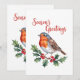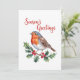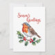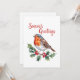 Julhälsningar från glad rödhake Inbjudan. En glad julrödhake sitter fridfullt på en röd bärgren, lugn och stillsam mitt i vinterns kyla, dess milda närvaro sprider värme, glädje och den stilla förväntan om julen.