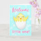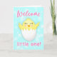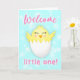 Detta gratulationskort för nybebisar har en söt bebiskullunge som kommer ut ur ett ägg med orden Välkommen lilla en. Detta kort är könsneutralt och kan användas för en nybebis flicka eller pojke.