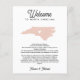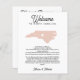Ett av de bästa sätten att få dina gäster från andra städer att känna sig speciella är ett välkomstbrev för bröllop som ingår i dina bröllopsgåvor. Dela ett välkomstmeddelande till dina bröllopsgäster i NORTH CAROLINA samt en dagordning eller schema för helgens evenemang. Framsidan visar ditt välkomstmeddelande med en siluettkarta över delstaten NORTH CAROLINA med ett hjärta inuti.