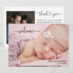 Ett enkelt födelse meddelande med ditt nyfödda barns foto med en överlagring av "välkommen" i ett stilrent vitt manus. Lägg bara till ditt barns namn och födelsedatum. Baksidan, med sin stilrena "tack", är den perfekta platsen för ett personligt meddelande och ett annat foto. Klicka bara på knappen redigera/personalisera för att anpassa denna design.
