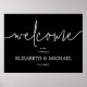 En svart affisch med Välkommen och dina bröllopsdetaljer i chic vit bokstavsaccent bröllop välkomstaffisch. Ändra till valfri storlek. Beställ som Ögonblicklig nedladdning eller UTRYCKT.