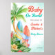 Baby ombord på en välkomstskylt för tropisk surfning på stranddusch. Handflatan träd, surfor, tropiska växter, återinför strand, surfning, tropiska temerade babyduschar.