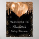 Välkomna poster för en giftig och glamorös babyskabare. En snyggt svart bakgrund som dekoreras med faux glitter-droppar, färgdroppstift, ballonger och faux guld glitter-stoft. Anpassa och lägg till ett namn. Bakåt: ingen design