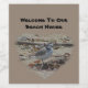 Den ynkliga snöplover som finns på vin flaska-märket står på stranden och ser sig omkring. Driftwood och sjögräs omger honom. Kustfågeln finns i ett hjärta med "Välkommen till vårt hus" som visas ovanför naturbilden. Anpassa all text enkelt om du vill.
