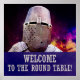 Stängningsyta av hjälm och en plåtsvävare av medeltida riddare mot den färgstarka bakgrund som påminner om rymden eller ett slagfält som du tycker om. Text - Välkommen till bord - tillagt