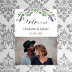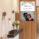 En vit chic bakgrund. Dekoreras med laverings blommigtar, blommor och eukalyptus greenery. Anpassa och lägg till ditt foto, namn och bröllop-datum.