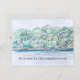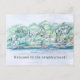 Ge hälsar en ny granne varmt välkommen med detta hälsningskort som omfattar ett litet bostadsområde vid kusterna med hus som ligger i träd och ett amerikanskt flagga med bläck och pennor. På motsatt sida finns en varm skugga av grått och text som du kan redigera efter behov.