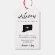 ett välkomstmeddelande till dina bröllop-gäster från Connecticut med dessa märkre för chic som är perfekt att fästa vid dina välkomstpåsar från bröllop. Utformningen innehåller ditt välkomstmeddelande i svart text med en silhuett karta om tillståndet Connecticut med ett hjärta inuti.