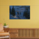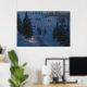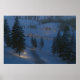 I denna fantastiska scen på en vinternatt leder en isig väg mellan snöborrningarna längs backe och över floden till en välkomststuga med ljus i fönstret. Spårvägen och stenstenarna över vatten tänds med varma glödande lyktor, och en brinnande eld bredvid väg sänder gnistor in i kallet nattetid luft.