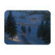 I denna fantastiska scen på en vinternatt leder en isig väg mellan snöborrningarna längs backe och över floden till en välkomststuga med ljus i fönstret. Spårvägen och stenstenarna över vatten tänds med varma glödande lyktor, och en brinnande eld bredvid väg sänder gnistor in i kallet nattetid luft.