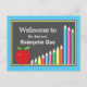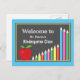 Det här välkomstkortet till skolvykortet innehåller ett tema i kretskort som accentueras med färgpennor och ett rött äpple. Den här designen är perfekt för alla elementära klass.Baksidan har anpassade för att du ska kunna lägga till ditt personliga meddelande.
