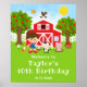 Denna söta och roliga välkomstskylt visar en brunhårig flicka med ljus hy bredvid en röd lada med en väderflöjel i form av en tupp. Det finns bedårande lantdjursom till exempel en ko, gris och höna. I bakgrunden syns en klarblå himmel, äppelträd, solsken, fjärilar och tusenskönor. Texten kombinerar feta och sans-serif-teckensnitt för en stilren och modern look. Detta är perfekt för en bondgårdsinspirerad födelsedagsfest.