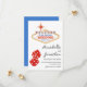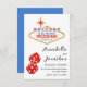 Denna anpassade spara-datum för bröllopsinbjudan har ett Las Vegas-kasinotema. Den klassiska Välkommen till Las Vegas-skylten är tryckt högst upp med exempeltext som du kan anpassa. Ett par röda glittertärningar är tryckta längst ned, Paret namn och exempel på bröllopsdatum är tryckta till höger om tärningarna i en elegant svart font.
