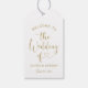 Modern antika guld och vita bröllop-välkomsttaggar för presenter har en snyggt typografisk utformning med kalligrafi av chic och hjärtaccent. Den enkla och elegant anpassningsbar som kan vara personlig med parets namn och deras bröllop-datum.