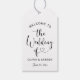 Modern taggar för pappra bröllop-julklapp för svart och rustik kraft har en snyggt för svart typografi med kalligrafi av chic och hjärtaccent. Den enkla och elegant anpassningsbar som kan vara personlig med parets namn och deras bröllop-datum.