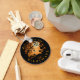 Orange och svart illustration av Halloween-scenen med en silhuett av en kyrkokyrkokyrkogård med gravstenar, fladdermöss som flyger ut från bältet mot ett gigantiskt måne, en svart katt på tak och en spindel och webben som hänger från ett vilt träd. Anpassa med din egen text och ditt eget teckensnitt som ett sätt att behandla dig själv eller en värdefull familjemedlem så att de känns speciella. Underbar för höst- och Halloween-säsongen. Unik exklusiv för digital konst i hand plockade till HJ-grafiklösning med hjälp av Vectornator.