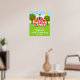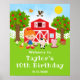 Denna söta och roliga välkomstskylt visar en flicka med rött hår och ljus hy bredvid en röd lada med en väderkvarn i form av en tupp. Det finns söta lantdjursdjur som en ko, gris och höna. I bakgrunden syns en klarblå himmel, äppelträd, solsken, fjärilar och tusenskönor. Texten kombinerar feta och sans-serif-teckensnitt för en stilren och modern look. Detta är perfekt för en lantbruks-tematisk födelsedagsfest.