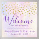 Välkomna till bröllop poster. Designad med fejkad guld-konfekt sprinklad längs toppen. En vattenfärgsbakgrund för blekens lila och gult.