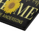 Text "Välkommen till vårt hem" med en gult solrosa som ersätter brev "O". Ljust gult på svart bakgrund med en kombination av skript, serif och sans serif typsnitt.