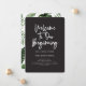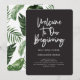 Välkommen till vår tropiska bröllopsbegynnelse med lövverk. Med trendig handskriven skrift och akvarell-illustration av tropisk botanisk lövverk. Del av en komplett bröllopssvit.