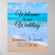 En välkomstskylt till vårt bröllop med ett fotografi av en klar blå havsutsikt med mjuka vågor längs en strand och mjuk brun sand. En blå himmel med fluffiga moln i fjärran. Lugn tropisk idyllisk havsutsikt.