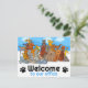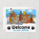 Ett varmt välkomnande till vårt veterinärkontor vykort med goda tecknad katter och hundar.