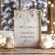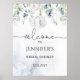 Välkomstskylt för vinterbröllopsfest med eukalyptus.