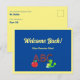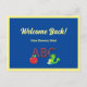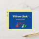 Baksidan av detta skoltema-vykort "välkommen tillbaka" har fyra rader med redigerbar text för lärarens namn, klassrumsuppgift, etc.