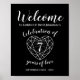 Välkomna gäster till 7:e bröllop-årsdagen party med detta moderna enkla konsthjärta som poster, tillgängligt i flera storlekar. Utformningen har vit typografi på onyx svart med ord Välkomsthälsning i manus och en hjärt-bergsten med ord välkommen firande i 7 år av kärlek. Anpassa med ditt eget namn, årsdag och bröllop-datum under. 7:e-Bröllop-årsdagen förknippas med den svarta gemstenen och hjärtat symboliserar kärlek. Andra matchande artiklar tillgängliga. Konst och design av www.mylittleeden.com på zazzle.