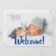 "Välkommen" i blått nyfött foto. Lägg till baby namn och födelsestatistik. Vilken förtjusande födelsedag för att presentera er söta pojke.