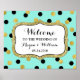 Välkomna till vårt Bröllop-tecken med eget namn och datum i turkos tealblått med svart och guld konetti mönster, observera att guld endast är fotografiskt.