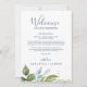 Dessa sommarens gröna välkomnande kort för brev och färdkort är perfekt för en elegant mitt i sommaren bröllop. Den botaniska designen har en lush arrangemang av färgade löv av eukalyptus, grey och grönt med subtila sprit av blommar för rosa. På kortets framsida finns ett välkommet brev och på kortets baksida finns en rutt i bröllop. Dessa anteckningar är perfekt för destinationsbröllop och hotellgästväskor.