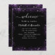 En svart bakgrund, dekorerad med lila faux glitter-gnistor. Anpassa och lägg till namn och bröllopsprogram. 1 lakan = 1 program tryckt kant till kant.