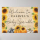 Denna vackra poster har tre snygga pumpor i orangen, svart och vit plaid, och leopard-tryck på en sprängtryckning. Söt gult solblommor gräns på skyltens sidor. "Välkomna" i en handskriven kursiv typografi visas överst tillsammans med mamma-to-be:s namn och "Baby Sprinkle" under.