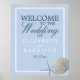 Den här välkomstposter i bröllop är perfekt för alla par som planerar ett strandbröllop på eleganten. Konstruktionen har en grå sanddollar och en ljusblå stjärtfisk med himlar blå bakgrund. Utformningen avslutas av med en känslig sand färg gräns. Den enkla och nya utformningen kan vara personligen till kostym för ditt speciella evenemang och kommer att vara perfektens välkomsttecken för alla strandteman party, inklusive: möhippor, förlovningar, möhippor, födelsedagsfester och mycket, mycket mer.