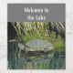 Välkomna gäster till ert hem i sjö med den här naturen som kallas vin flaska-märkning med solsköldpadda. Den vackra sköldpaddan balanseras på sten längs sjö vatten med höga jordtoner och mer i bakgrunden. Vreden och sköldpaddan kan ses i vatten. "Välkommen till Sjö" visas mot en mörk grått-banderoll överst och kan enkelt anpassas om du vill. Den här etiketten hjälper dig att skapa en välkomstgåva till ditt hem eller dina gäster för hyreshyresgäster i perfekten.