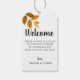 Rustic och chic vattenfärgsskog lämnar i höst, bröllop välkomnar märkre för presentsäck. Anpassa och anpassa teckensnittet stil, färg och storlekt.