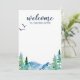 Dessa välkomstbrev för uthyrning av Rocky Mountain-semesterboende är perfekta för ett bed and breakfast i bergen. Designen har ett blågrönt målat vildmarkslandskap med akvarelltall, fåglar och berg. Skriv ditt välkomstbrev för hand på framsidan och lägg till fler detaljer och saker att göra på baksidan av kortet (valfritt).
