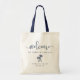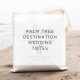Välkomna gäster till ditt destinationsbröllop med den här chicen och den moderna personligen tote bags. Designfunktionerna "Välkommen" i marinblått, handskript för kalligrafi, med utrymme att anpassa till din position, namn och datum i bröllop. Ett par silhuetteillustrationer från handflatan träd kompletterar konstruktionen.