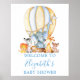 VälkomstPoster för den moderna Eleganten Watercolor Baby djur Luftballong Baby Shower. Baby djur omfattar Elephant, Monkey, Giraffe, Rhino, Zebra och Lejon. Blå text.