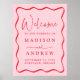 Gör ett djärvt första intryck med denna moderna Rosa och Röda Vågigt Ram Bröllop VälkomstanPoster. Dina uppgifter om namn och bröllop visas med röda bokstäver på mjuk rosa, framtagna av en slående vågigt gräns för ett modernt men romantiskt utseende. Perfekt för Alla hjärtans dag bröllop, ceremonier i vår, eller djärvt bröllop, poster detta välkomna dubblor som både décor och som en snyggt. Välj professionell som ska skrivas ut eller hämtas omedelbart för att skrivas ut i hemmet.
