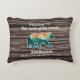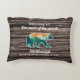 Dekorator dekorativ kudde för familjens hem för berg/vildmark. En björn som är täckt med berg av grönt och en komass ligger på en rustisk mörk brun träbakgrund. Anpassadets text säger: "Välkomna till nacke i skogen." Anpassa dig ytterligare med din familj namn och ditt hem.
