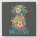 Skydda yta med tropiskt mjöl. Stenen underlägg från Välkomstananassamlingen och har en fetstilt ananas krökt med hibiscus blommor och en turkos "WELCOME" på svart. Hållbar och livfull, det är perfekt för party, semesterhyror eller utomhusunderhållning.